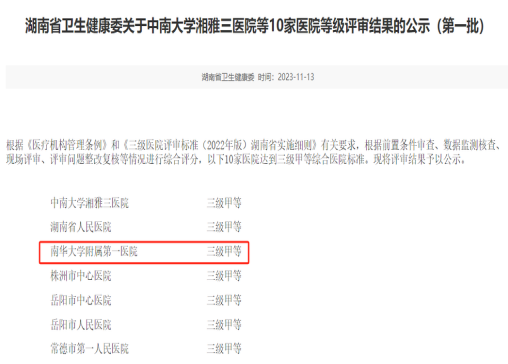南华大学附属第一医院创建于1943年,坐落在历史文化名城——衡阳,是国家卫生部首批授予的三级甲等医院、湖南省人民政府与国家卫健委共建附属医院、省域医疗中心。医院集医疗、教学、科研、预防、保健、康复于一体,以诊治各种复杂、疑难和危急重症疾病而享誉省内外。医院占地面积107亩,编制床位2315张,开放床位2500张,设有7个临床中心,33个临床学科,8个医技科室。年门急诊约180万人次,年出院约10万人次,年手术量约3.5万台次。医疗服务量列全省单体医院第4,省级医院第1。全国公立医院绩效考核排名第104名,为A+级单位。