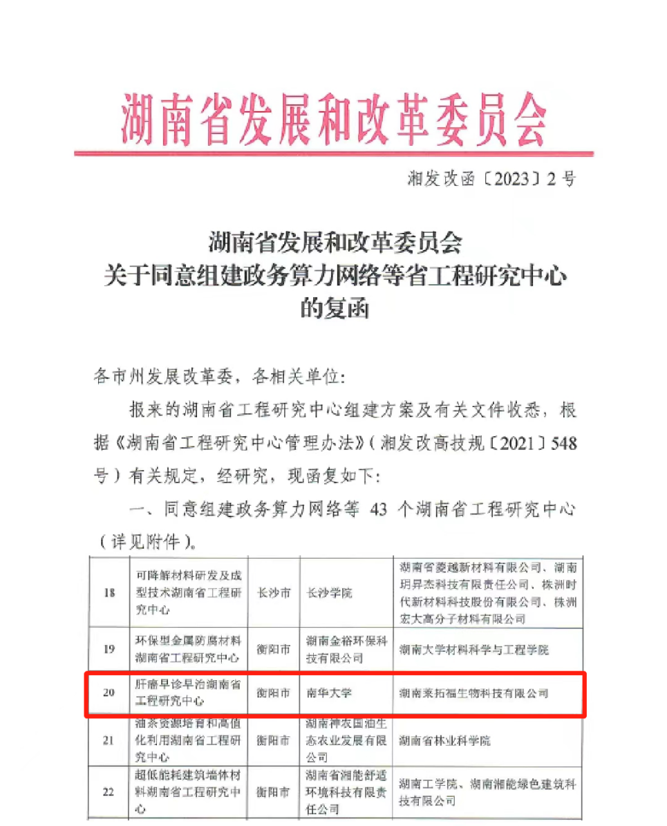 2023年1月28日,湖南省发展和改革委员会公布2022年湖南省工程研究中心组建名单。在南华大学的牵头与大力支持下,依托我院的“肝癌早诊早治湖南省工程研究中心”正式获批,南华大学教授兼我院双聘教授曹德良博士为中心负责人,我院祖旭宇教授、陈国栋教授为该工程研究中心管理委员会中心副主任,湖南莱拓福生物科技有限公司为该工程研究中心的核心联合建设单位。