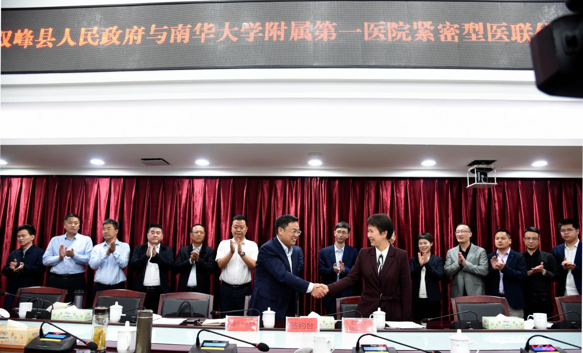 5月22日,我院与双峰县人民政府、双峰县人民医院就建立紧密型医联体举行签约仪式。出席签约仪式的有医院党委书记祖旭宇,党委副书记、执行院长唐惠芳,副院长兼派驻双峰县人民医院院长黄秋林,双峰县委书记彭石清,县委副书记、县长李基联,双峰县人民医院党委书记贺逍等。