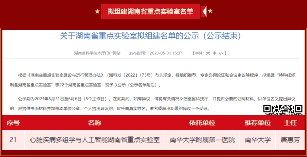 5月31日,湖南省科技厅公布湖南省重点实验室拟组建名单,拟组建22个湖南省重点实验室。其中以我院为依托单位,唐惠芳教授为实验室主任的“心脏疾病多组学与人工智能湖南省重点实验室”成功获批,实现我院省重实验室新突破。