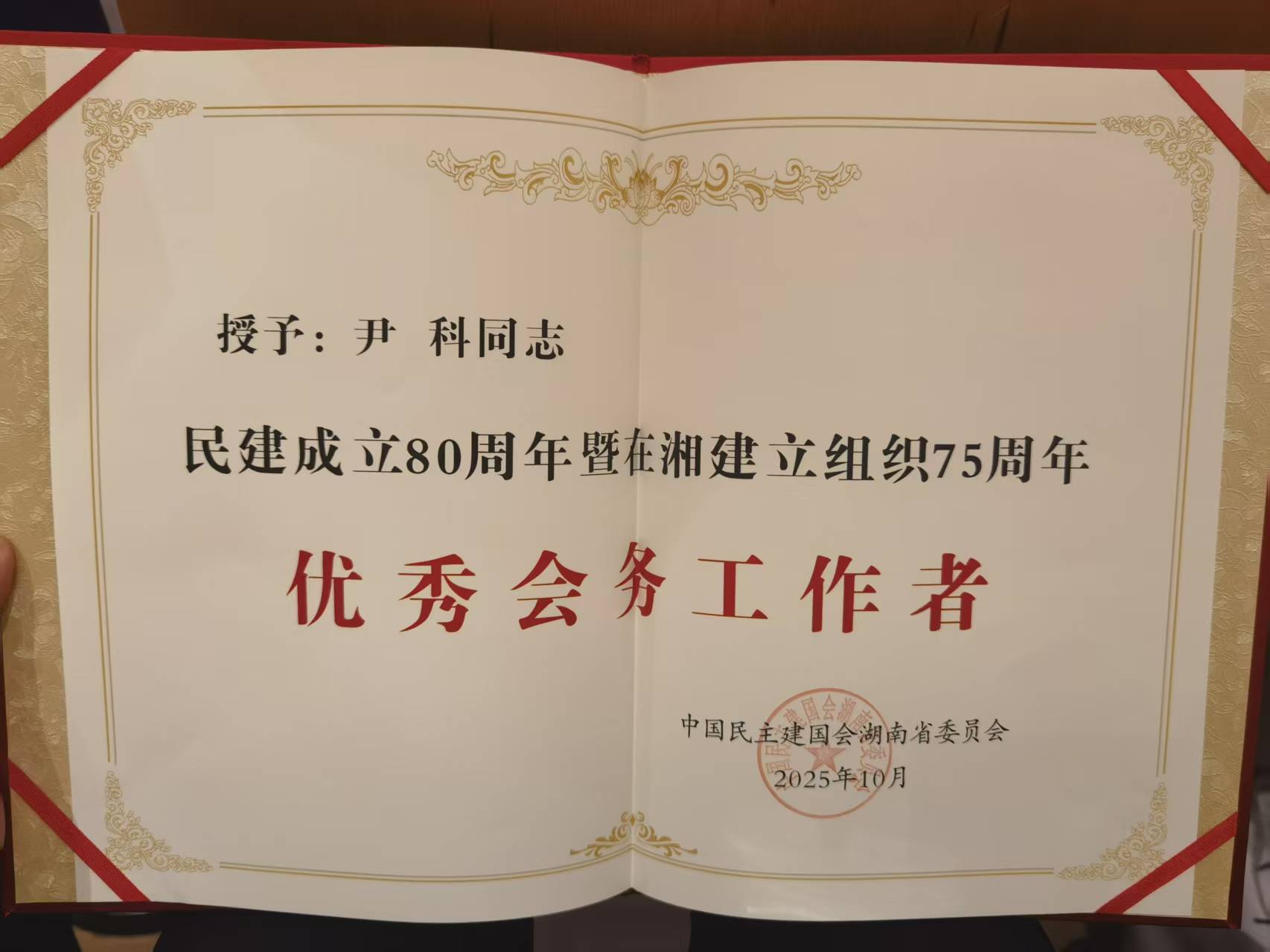 在近日举行的中国民主建国会成立80周年暨在湘建立组织75周年庆祝大会上,南华大学附属第一医院骨科尹科因在会务工作中的突出表现,被授予“优秀会务工作者”荣誉称号。这是继9月在庆祝中国民主建国会衡阳市委会成立70周年之际荣获“优秀会员”称号后的再次获奖,充分体现了他在民建组织中的积极作为与贡献。