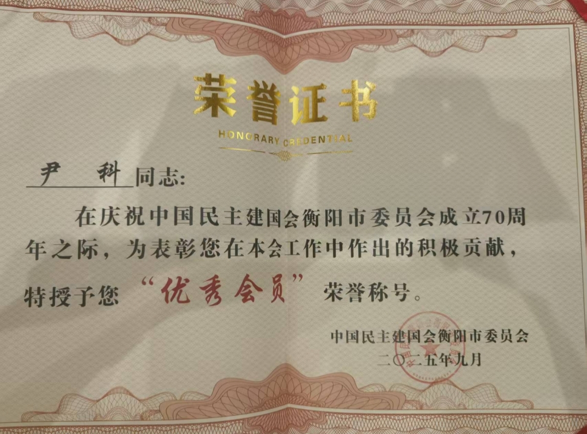 尹科作为南华大学附属第一医院的骨干医师,长期积极参与民建组织的各项活动与服务工作,在推动组织建设、服务会员、参与社会服务等方面发挥了积极作用。连续获得“优秀会员”和“优秀会务工作者”荣誉,不仅是对他个人会务工作的充分肯定,也体现了医疗卫生界会员在多党合作事业中的积极作为与责任担当。